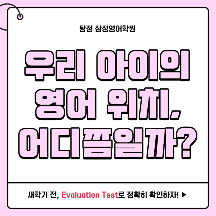 * 탕정 삼성영어는 1호점과 2호점이 따로 있습니다. 위치 및 전화번호는 글 하단을 참고해 주세요 :) * 탕정 삼성영어는 네이버 예약 상담이 가능합니다! 글 하단을 참고해 주세요 :) 초등학교 입학 전, 또는 새 학기를 앞두고 부모님의 마음은 아이보다 먼저 바빠집니다. "남들보다 늦은 건 아닐까?" "지금 시작이 맞는 걸까?" "우리 아이 영어, 지금 어디쯤일까?" 그래서 대부분 영어 학원을 알아보고 레벨 테스트부터 찾아보게 됩니다. 하지만 테스트를 보고 나서도 마음이 완전히 놓이진 않습니다. ▶ 빨리 시작하는 것보다 '제대로 아는 것'이 먼저입니다. 삼성영어 Evaluation Test, 아이에게 딱....... <img src="https://blogthumb.pstatic.net/MjAyNjAxMjRfMjQ2/MDAxNzY5MjQwNDA1OTU4.6CA8NT2qwityINxMuZIyh1xrF6pLz3Db0neVFQWtLxkg._LokrKzY1cs226-rpZFxBF3ncGSeN6arAAT4VY4THDgg.PNG/%C1%A6%B8%F1%C0%BB_%C0%D4%B7%C2%C7%D8%C1%D6%BC%BC%BF%E4..png?type=s3" />