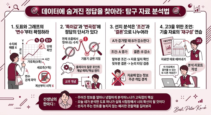 1. 도표와 그래프의 '변수'부터 확정하라 자료를 보자마자 수치에 매몰되지 말아야 한다. 가로축(X축)과 세로축(Y축)이 의미하는 물리량이나 지표가 무엇인지, 단위(%, 명, 점수 등)는 무엇인지 확인하는 것이 첫 단추이다. 변수의 관계를 파악하지 못한 채 계산부터 시작하는 것은 오답으로 가는 지름길이다. 2. '특이값'과 '변곡점'에 정답의 단서가 있다 전체적인 흐름에서 벗어나는 수치나 그래프의 기울기가 급격히 변하는 지점을 주목해야 한다. 출제자는 바로 그 지점에서 개념의 예외 상황이나 핵심 원리를 묻는 선지를 구성한다. 자료의 흐름이 바뀌는 이유를 교과 개념과 연결해 해석하는 훈련이 필요하....... <img src="https://blogthumb.pstatic.net/MjAyNjA0MDVfMTMy/MDAxNzc1MzQ0MDIwNTA3.ZRsNUMv68HcU98HdIWEmIgvXCCtZtZQBTgtSZeXYM6gg.xhfHA57yel6B5zQMve27Rqo3xxNp4-6hDrys349cUwgg.PNG/image.png?type=s3" />