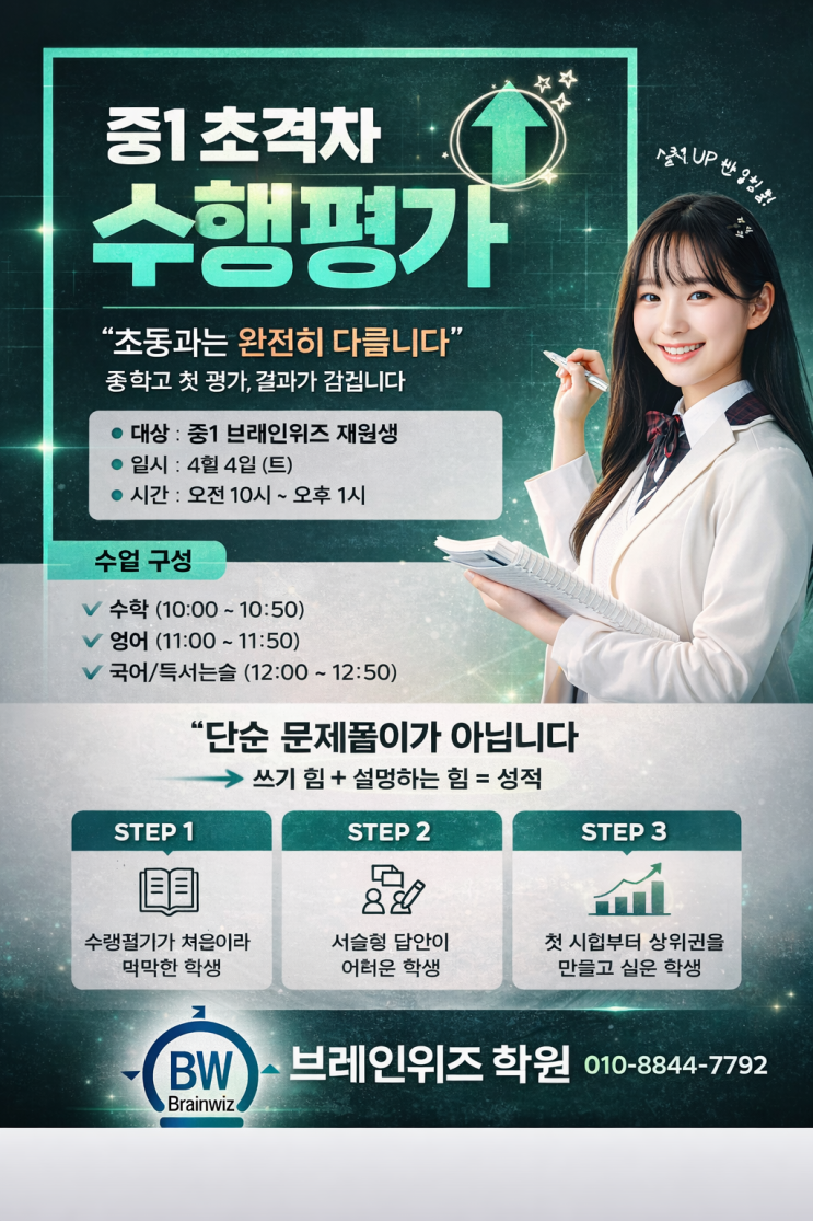 안녕하세요? 미래를 리드하는 인재를 양성하는 곳 내포신도시 국영수 전문 종합학원 브레인위즈 내포미래점입니다. 중학교에 올라오면 가장 먼저 부모님들이 당황하시는 부분이 있습니다. “시험을 안 본다는데… 성적은 어떻게 나오는 거죠?” 바로 수행평가입니다. 초등학교와 달리 중학교는 서술형 + 과정 중심 평가가 성적을 좌우합니다. 문제만 맞추는 아이 vs 생각을 쓰고 설명하는 아이 이미 여기서 성적 격차는 시작됩니다. 수행평가 대비 특강이 왜 필요한가요? 특히 중1 학생들은 ✔ 수행평가가 처음이라 막막하고 ✔ 서술형 답안 작성이 어렵고 ✔ 공부를 했는데도 점수가 안 나오는 경우가 많습니다 그래서....... <img src="https://blogthumb.pstatic.net/MjAyNjA0MDJfMTcz/MDAxNzc1MTM3MTY5NDg4.a4zb3F7zSFVo-FRmXsqGUACdBvGzDLTPpSN0I6wqWuUg.HZshPmaJrSTDX5chSLg-m-kocL99rH64qjkYBSBAk_8g.PNG/ChatGPT_Image_2026%B3%E2_4%BF%F9_2%C0%CF_%BF%C0%C8%C4_10_38_48.png?type=s3" />