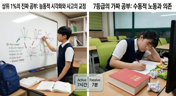 우리의 금쪽이 시험 기간만 되면 책상 앞에 7시간, 8시간씩 엉덩이를 붙이고 앉아 있는데... 왜 제 성적은 늘 제자리일까요? 잠을 줄여가며 새벽까지 문제집과 씨름하지만, 막상 성적표를 받으면 허탈함만 남는 학생과 학부모님이 정말 많습니다. 하지만 충격적인 사실이 드러났습니다! 상위 1%의 극상위권 학생과 7등급 학생의 일상을 정밀 분석해 본 결과, 하위권 학생은 7시간 반을 책상에 앉아 있었지만, 실제 실력을 높이는 '진짜 공부'를 한 시간은 단 7분도 채 되지 않았습니다. 나머지는 공부를 하는 '척'을 하거나, 의미 없는 '노동'에 시간을 쏟은 셈입니다. 무엇이 이런 극명한 차이를 만드는지, 4가지....... <img src="https://blogthumb.pstatic.net/MjAyNjA0MDNfMTAx/MDAxNzc1MjI1ODYzNTcz.1PkIh3x5zxUwhXEVRAaLb3RP6_sCYfw6VeWBbmhnXdwg.LuD4RfY1ZTgwKGwV_VYt_4NJJCO5nHXK38ZYN1K4TlMg.PNG/00.png?type=s3" />