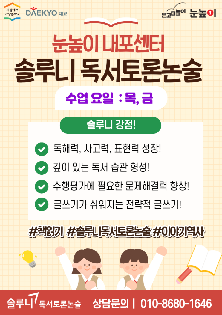 안녕하세요 대교 솔루니 내포입니다. 눈높이 러닝센터 내포학원에서 매주 목요일, 금요일 논술 전문 선생님께서 지도하시는 '솔루니 독서토론논술' 수업이 진행되고 있습니다. 깊이 읽는 독서 습관 형성! 독서 전.중.후 학습법으로 책을 깊이 읽는 독서 습관을 길러 주고, 흥미를 더하는 읽기 전략으로 지문 이해력을 높여 줍니다. 수업을 리드하는 발표력 훈련! 도서로 학습 배경 지식을 쌓고, 토론 수업으로 자신의 생각을 자신있게 표현하는 발표력을 길러 줍니다. 생각하는 힘을 키워 주는 쓰기 전략으로 글쓰기 능력을 쌓아가며 다양한 활동으로 서논술형과 수행평가에 대비한 문제해결력을 길러 줍니다. 책을 읽고 나서 "왜....... <img src="https://blogthumb.pstatic.net/MjAyNjA0MDNfMiAg/MDAxNzc1MTgxMjQ1MDU1.iH6CjLVFw4egS6_4Dd99oOk_ajbiOlMnmOOTPjqbnssg.qAqh4DOeg2D7O7lc6hHw8711xmA39JfCVuDawpCEcnUg.PNG/%B3%BB%C6%F7_%BC%D6%B7%E7%B4%CF_%BE%C8%B3%BB%B9%AE.png?type=s3" />