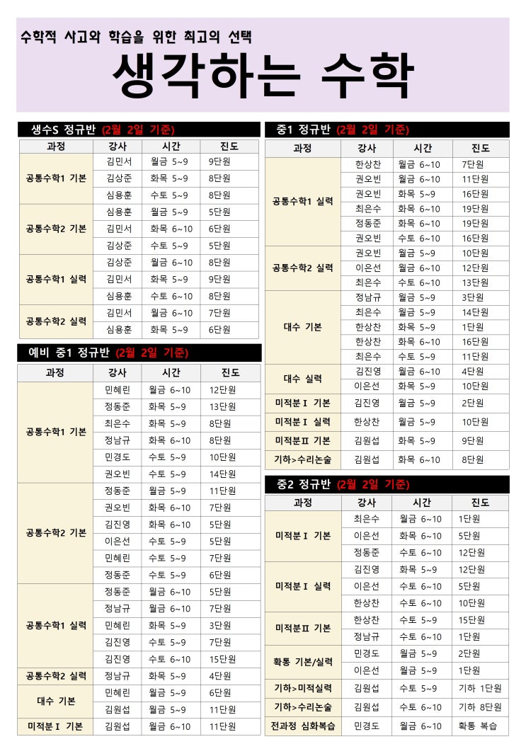 생각하는 수학 정규반 진도(2월 2일 기준)