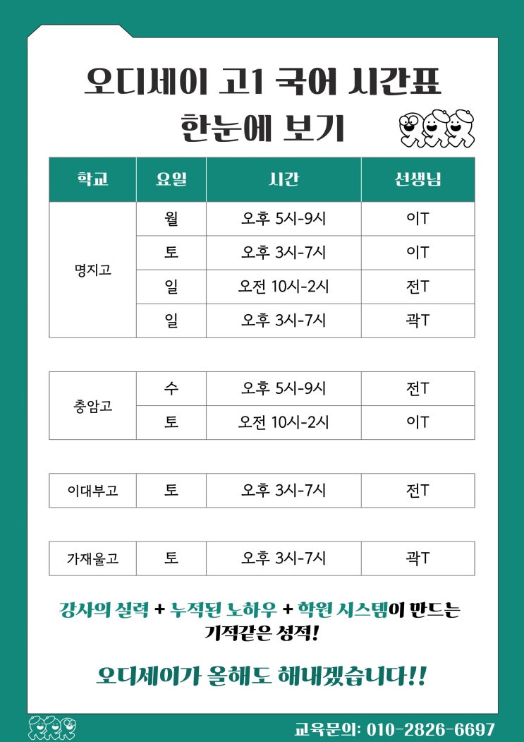 [서대문구학원/오디세이수학국어] 오디세이 국어 2026 고1 시간표 정리 안녕하세요 오디세이 학원입니다. 오늘은 저희 오디세이 학원의 고1 국어수업 시간표를 안내드립니다! 2026년 오디세이는 명지고, 충암고, 이대부고, 가재울고 이렇게 네 개 학교의 국어수업을 진행합니다. 각 학교별 시간표를 정리해놨고 가장 아래 한눈에 확인하실 수 있도록 정리도 해놨습니다. 보고 궁금하신 점은 언제든 문의주세요! 위의 시간표들을 한 장에 정리해봤습니다! <img src="https://blogthumb.pstatic.net/MjAyNjAyMDFfNDUg/MDAxNzY5OTIyMzEzOTg0.lPKNZEJlUf2aCsAXOggrk9e-uvDDRGTuIcrWGQEnZPUg.uwRMOb1AcFukSHaTqeGb13nG2hdiuzbTslPoDET-wokg.JPEG/KakaoTalk_20260201_115418978.jpg?type=s3" />