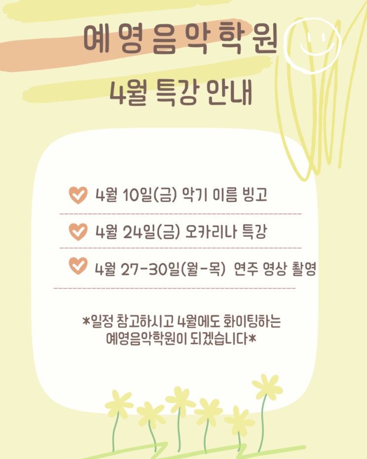 예영음악학원 4월 특강 안내 안녕하세요, 예영음악학원입니다 따뜻한 봄과 함께 4월 특별 일정 안내드립니다! 우리 아이들이 음악을 더 즐겁게 경험할 수 있도록 다양한 프로그램을 준비했어요 4월 주요 일정 ✔ 4월 10일(금) 악기 이름 빙고 활동 → 재미있게 배우는 음악 기초 놀이 수업! ✔ 4월 24일(금) 오카리나 특강 → 감성적인 소리를 직접 연주해보는 시간 ✔ 4월 27일(월) ~ 30일(목) 연주 영상 촬영 → 아이들의 소중한 연주를 영상으로 기록합니다 아이들이 음악을 통해 자신감을 키우고 성장하는 시간이 될 수 있도록 항상 노력하겠습니다 4월에도 즐겁고 의미 있는 수업으로 찾아뵙겠습니....... <img src="https://blogthumb.pstatic.net/MjAyNjA0MDNfNjAg/MDAxNzc1MTk5OTA5MTU2.lJhVUTZFlzIhSBLiuoHCxwqGU0RewEprEu3wpUnYnDgg.Fx8dCDrLY-3iyqrCXFk6iezut9O8FHOe4byUF0JfPbQg.PNG/900%A3%DF1775192130164.png?type=s3" />