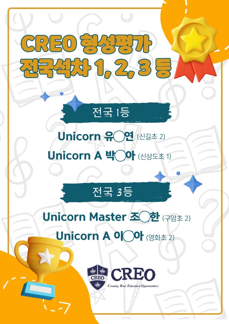 <CREO 동작캠퍼스 전국 형성평가 레벨별 전국 1, 2, 3등 학생 다수 배출!!>