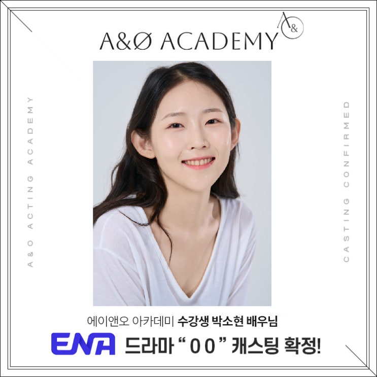 에이앤오 연기학원 수강생 박 소 현 배우님이 ENA 드라마에 캐스팅 확정되셨습니다! 축하드립니다! 앞으로 더 많은 활동을 이어가실 박소현 배우님에게 많은 관심과 응원 부탁드립니다. 에이앤오 연기학원의 캐스팅이 더 궁금하다면?? #캐스팅 #배우지망생 #오디션 #연기 #신인배우 #학원 #연기학원 #오디션정보 #배우 #출연 #드라마출연 #캐스팅 #수업 #연기수업 #캐스팅디렉터 #an캐스팅 #신촌연기학원 #마포구연기학원 #에이앤오연기학원 #ENA #ENA드라마 #비공개드라마 #배역캐스팅 #단역캐스팅 <img src="https://blogthumb.pstatic.net/MjAyNjAxMjhfMTEx/MDAxNzY5NTcwMzcyNTg2.i_CDVq6BHeA8Bf2CRjQytnPeKbPYFD7J9f9f4XphNXIg.ScOscMwG2Zt06ZbhRjW1dWy7heMcKe5jr_RpuNDwWw4g.JPEG/%B9%DA%BC%D2%C7%F6_%BE%C6%B3%CA.jpg?type=s3" />