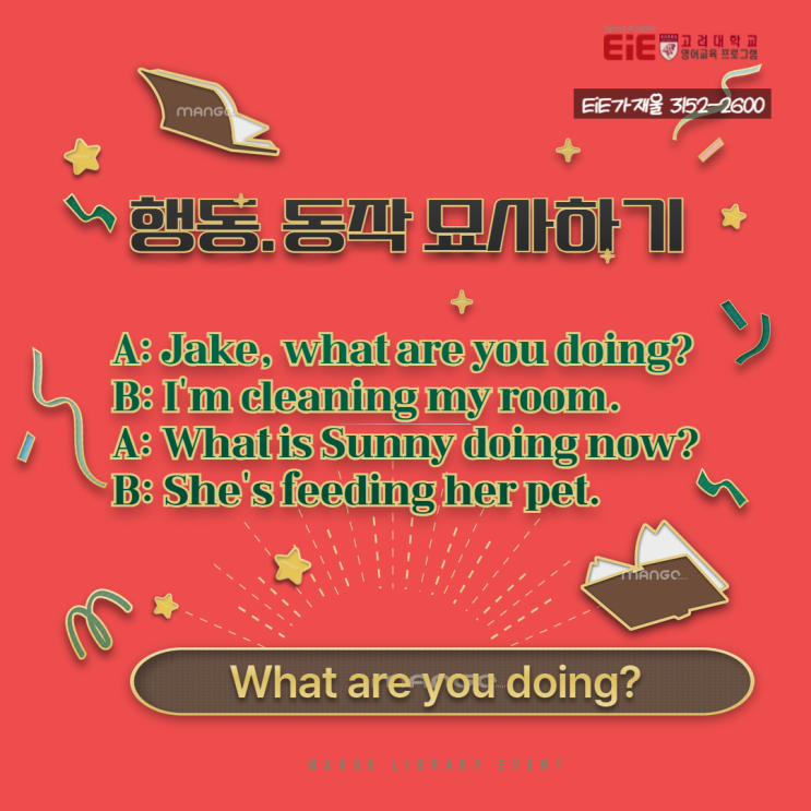 안녕하세요~ EiE 고려대 국제어학원 서대문가재울 캠퍼스입니다. 오늘은 현재의 행동이나 동작을 표현을 배워볼까요~~~~? 현재의 행동이나 동작을 물을 때는, "What + be동사의 현재형 + 주어 + doing?" 이라고 말할 수 있습니다. 질문에 대답할 때는, "주어 + be동사의 현재형 + v-ing..."라고 말해요~. +Expression Plus Sunny: What are the children doing right now? (아이들은 지금 무엇을 하고 있어요?) Sherlock: They're playing football. (그들은 축구를 하고 있어요.) Sherlock: Is the boy doing his homework? (그 소년은 숙제를 하고 있니?) Sunny: Yes, he is. (응, 그래.) / No, he isn't. (아니....... <img src="https://blogthumb.pstatic.net/MjAyNjAxMjlfMTI5/MDAxNzY5NjY5ODUwMjg3.b1LawOxVLGTr5-sOQ5nPR0vTT622bPsbQjATh-S9vUIg.TsxzteVd5wMNV5gTzXbbvmBKksjurIpgPIBaVsbdngYg.PNG/0127.png?type=s3" />