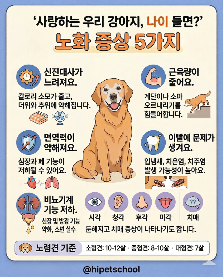 우리 아이, 벌써 노령견일까? '강아지 노화 증상 시간이 참 빠르죠? 우리 댕댕이의 시계는 사람보다 훨씬 빠르게 흘러갑니다. 겉모습부터 속 건강까지, 노화가 시작되면 나타나는 신호들을 미리 체크해 보세요! 1️⃣ 피모의 변화 (Grey Hair) 입 주변이나 얼굴 전체에 흰색/회색 털이 늘어납니다. 모질이 푸석해지고 윤기가 사라지며, 피부 탄력이 줄어들 수 있습니다. 2️⃣ 신진대사 저하 및 체온 조절 능력 약화 기초 대사량이 낮아져 칼로리 소모가 줄어듭니다. (식단 조절이 필요한 시점!) 추위와 더위에 민감해져 여름철 냉방병이나 겨울철 저체온증을 더욱 주의해야 합니다. 3️⃣ 근육량 감소와 관절 문제 뒷다리 근육이 눈에....... <img src="https://blogthumb.pstatic.net/MjAyNjA0MDJfNzMg/MDAxNzc1MTAwNTE2MjE3.yQ1-OzlakKM08lYHnKzbSRcInmm9w_Sb5roDwXBCfRcg.9qXM8vgbITMhoRKaui_cGB8G8KGJP-pznIAwA9wP6rAg.PNG/%B0%AD%BE%C6%C1%F6%B3%EB%C8%AD%C1%F5%BB%F3_5%B0%A1%C1%F6.png?type=s3" />