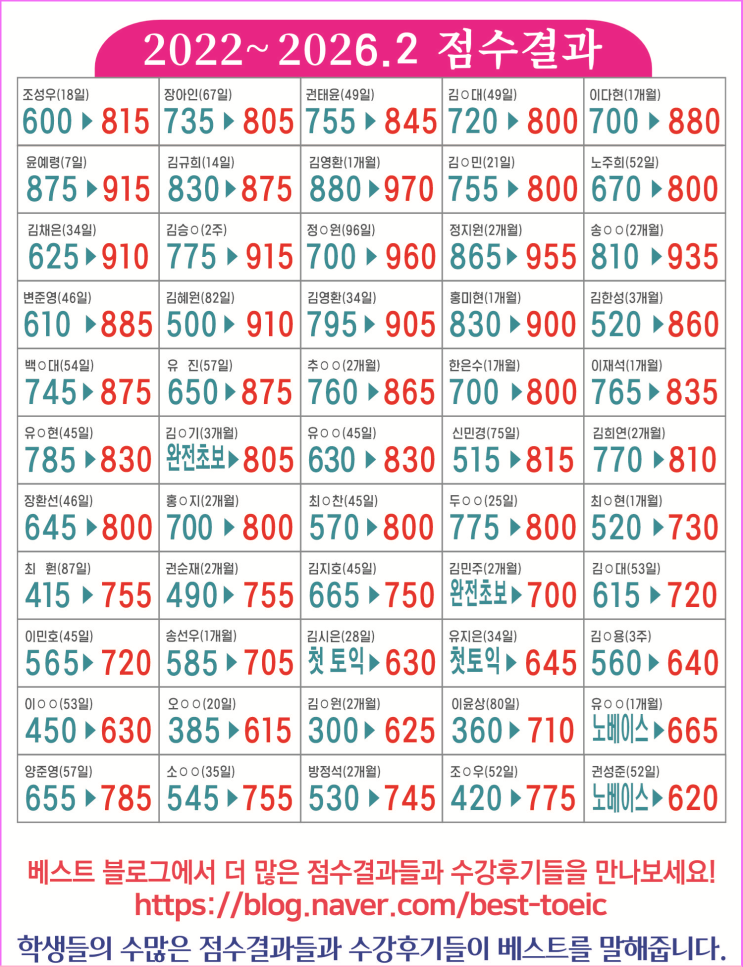 [익산토익학원] 베스트토익 2018년 8월 ~ 2026년 1월 점수결과 모음집 및 왕초보 탈출반(1개월과정) 4월 6일 개강!