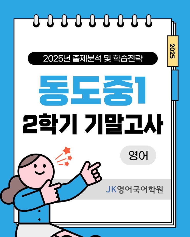 안녕하세요. 동도중 영어 내신을 전문적으로 지도하는 동도중 영어학원, JK영어국어학원입니다. 동도중 학생 여러분, 새 학기는 잘 시작하셨나요? 새 학기가 시작된 지금, 2025학년도 1학년 2학기 영어 기말고사를 분석해 보며 동도중 영어학원에서 바라본 앞으로의 동도중 영어 내신 대비 방향을 함께 정리해 보겠습니다. 2025학년도 동도중학교 1학년 2학기 영어 기말고사는 지난 중간고사 대비 난이도가 소폭 상승했습니다. 단어와 문법 기초를 탄탄히 다져두면, 본문 이해 및 대화문·내용일치 문제는 안정적으로 해결할 수 있는 구조였습니다. 그럼에도 난이도가 상승한 이유는 전통적으로 동도중학교에서 자주 출제하던 ‘어법 변별형 문항....... <img src="https://blogthumb.pstatic.net/MjAyNTEyMjlfMTcx/MDAxNzY2OTk3OTQxNTE0.sRPDOs4zx_rz93AmT7M4x2rO_bIhHBbWhs53ALDneN8g.pEfsQ3n1GdSYu9PUBYWOuAk4iMppynPLrhiDYiNlgkQg.JPEG/1.jpg?type=s3" />