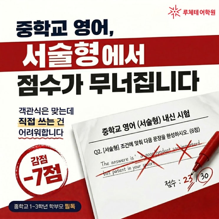 요즘 중학교 영어 내신 때문에 고민 많으시죠? 학생들 시험지를 보면 객관식은 거의 다 맞았는데… 서술형에서 점수가 크게 깎이는 경우가 있습니다. 부모님들은 “공부를 덜 했나?” 생각하시겠지만, 알고 보면 문제는 그게 아닙니다. 읽는 건 되는데, 쓰는 건 안 되는 이유 아이들 보면 단어도 외우고 지문 해석도 꽤 잘하지요. 그런데 막상 시험에서 “이 내용을 영어로 써보세요” 이렇게 나오면 멈춰버립니다. 왜 그럴까요? 읽기(Reading)와 쓰기(Writing)는 완전히 다른 영역이기 때문이에요. 읽기는 이해 중심 쓰기는 구조 + 문장 구성 + 표현 능력 즉, 따로 훈련하지 않으면 절대 자연스럽게 연결되지 않는 영역입니다. 요....... <img src="https://blogthumb.pstatic.net/MjAyNjA0MDNfMjg4/MDAxNzc1MjA1MDg0OTQz.sQjcSe4AtyqNfrHMjnGrjVaS81tLqxzHqUMNhhUOB5sg.1wGh-BLZPwRiToVqjvCuJKBliAvSyQ1MYbHpGcJ20pQg.JPEG/%B7%E7%C3%BC%C5%D7%BE%EE%C7%D0%BF%F8_%BF%F8%C0%E5%B8%F0%C0%D3_%BB%E7%C1%F8_20260401_6.jpg?type=s3" />