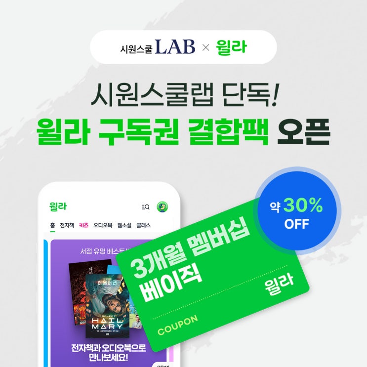안녕하세요 시원스쿨랩입니다! 여러분, 요즘 유튜브나 인스타 도파민에 너무 중독되어있진 않으신가요..?! 퇴근하고 책 읽어야지, 시험끝나면 책 읽어야지 다짐만 하면서 자꾸만 미루고 계신 분들! 오늘 꼭 집중해주세요 정말 반가운 소식을 들고왔는데요 시원스쿨랩이 전자책·오디오북 플랫폼 윌라와 손을 잡았습니다! 토익인강 학습에 독서 콘텐츠까지 더한 시원스쿨랩 X 윌라 구독권 결합 패키지가 새롭게 오픈됐어요! 공부하면서 자기계발까지 한 번에 챙기고 싶은 분들, 오늘 블로그 꼭 주목해주세요 윌라가 어떤 플랫폼이냐고요? 윌라는 전자책과 오디오북을 포함해 22만 권 이상의 콘텐츠를 보유한 독서 플랫폼이에요. 자기....... <img src="https://blogthumb.pstatic.net/MjAyNjA0MDNfODMg/MDAxNzc1MTgyNjEyMTE3.XNyPF3FqQLWiKt-nwJR62hcpohzqeM2mpNb_hUO9mesg.4i9ovom2t7FwLiNeldTM9tbeXTvsUbxVsHhxr2RW54Ug.JPEG/%C0%AA%B6%F3%B1%B8%B5%B6.jpg?type=s3" />