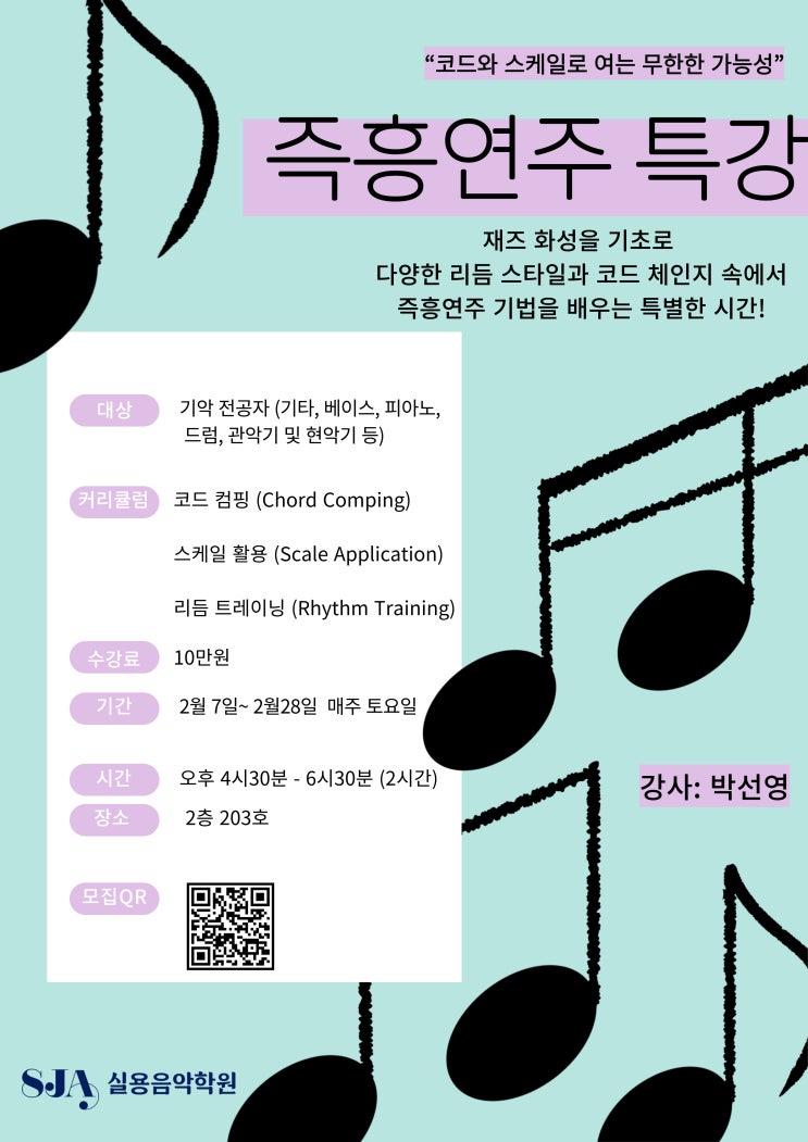 안녕하세요! SJA 실용음악 학원입니다. 방학 시즌을 맞이하여 즉흥 연주 수업을 개강했습니다! 즉흥연주 특강 POINT! ⭐ 평가 기준 충족: 음악 대학 실기 시험에서는 즉흥연주 능력이 중요한 평가 요소로 포함됩니다. 실전 대응력 강화: 예상치 못한 코드 진행이나 리듬 변화에 즉각적으로 반응할 수 있는 능력을 길러줍니다. 창의성 발휘: 단순히 악보를 연주하는 것이 아니라, 자신만의 해석과 표현을 더해 차별화된 연주를 보여줄 수 있습니다. 무대 자신감: 즉흥연주를 통해 무대에서 흔들리지 않고 자유롭게 연주할 수 있는 자신감을 얻게 됩니다. 기악 전공자 (기타, 베이스, 피아노, 드럼, 관악기 및 현악기 등) 친구....... <img src="https://blogthumb.pstatic.net/MjAyNjAxMjZfNTUg/MDAxNzY5NDE4NjE4NTA1.oqf1PUKhF_YNjSRWrVNdc6RuRs8Jmp_jA-YGHxaDsnsg.DAbDPIx_Sp1B9yXT63uXRUMipFjP1fo5mitX0mRp-8sg.JPEG/%C1%A6%B8%F1%C0%BB-%C0%D4%B7%C2%C7%D8%C1%D6%BC%BC%BF%E4_-001_%284%29.jpg?type=s3" />