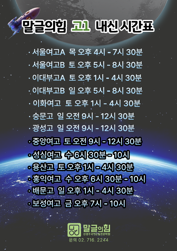 2026년 한 달이 벌써 끝나갑니다. 영하 10도가 넘는 강추위에 잘 지내고 계신가요~ ? 냉동실 온도와 비슷한 기온이라 옷을 여미고 여며도 춥게만 느껴집니다. 그래도 이 추위가 지나면, 따뜻한 햇살이 고소하게 느껴지는 봄이 오겠지요. 오늘은 예비 고1 친구들의 고등학교 발표가 있었드랩죠.(어디 나라 말...?) 말글의힘 친구들도 'OO학교 됐다'며 흥분된 목소리로 전화를 주었네요. 그래서 오늘은 바로! 2026년 고1, 고2 학교별 내신시간표를 알려드리겠습니다. 먼저, 고1 시간표 알려드립니다. 다음은 고2 내신시간표입니다. 작년 내신 시간과 동일한 학교들도 있네요. 내신 수업은 시험 전 약 6 ~ 7주 전부터 시작합니다. (3월 둘....... <img src="https://blogthumb.pstatic.net/MjAyNjAxMjlfMjQ4/MDAxNzY5NjgwODU5MjIy.vhQh368Rm8GtCkMUGxQr8ZfmtKBYLM4uljbACClwCbYg.ZTwKrjwa1B49WxYmF-9bm8rB0MGgRYSSpkQuHPLaWkQg.PNG/%B0%ED1_%B3%BB%BD%C5%BD%C3%B0%A3%C7%A5.png?type=s3" />