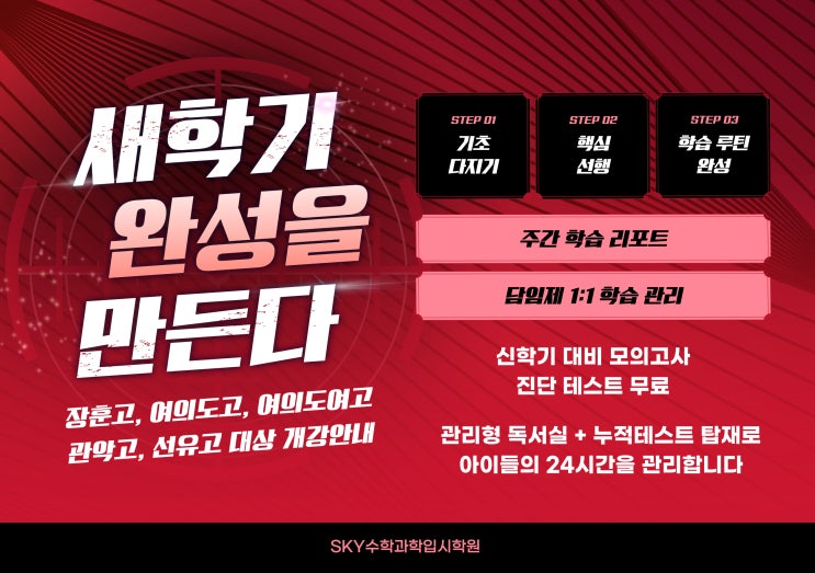 안녕하세요. 스카이수학과학입시학원 이정희원장입니다. 오랜만에 블로그 포스팅으로 인사드립니다. 사실, 너무 바쁘게 주7일 24시간 아이들을 위해 발로 뛰고 있기 때문에 학원을 홍보할 시간도 블로그를 작성할 시간도 없었던 것 같습니다. 저희 학원을 찾아오시는 분들은 모두 소개로 오시는 분들이셔서 늘 소문내주시는 학부모님들께 감사할뿐입니다. 관리형 독서실도 전 좌석 마감되어, 월-토 제대로 학습 중입니다!!!! 뭐든지 할려면 제대로 해야겠죠? 스카이는 재원생만 등록 가능하며 매주 주간 피드백이 발송되고, 벌점 기준표를 도입하여 확실하게 자습환경을 조성합니다. 고등학교 배정 이후, 내신 전략은 이미 갈립니다. 우리 친구들....... <img src="https://blogthumb.pstatic.net/MjAyNjAyMDFfMTQw/MDAxNzY5OTQ2ODc4MTEw.QL06iZ53N07wigkpdd922dewZ16jFGwHvjVA7tYHaI0g.Pz4Hhv8Bqm7SLAiesLkyteJbcRknro1yh-Bde2Uy7L0g.JPEG/%C1%A6%B8%F1%C0%BB-%C0%D4%B7%C2%C7%D8%C1%D6%BC%BC%BF%E4_-001.jpg?type=s3" />