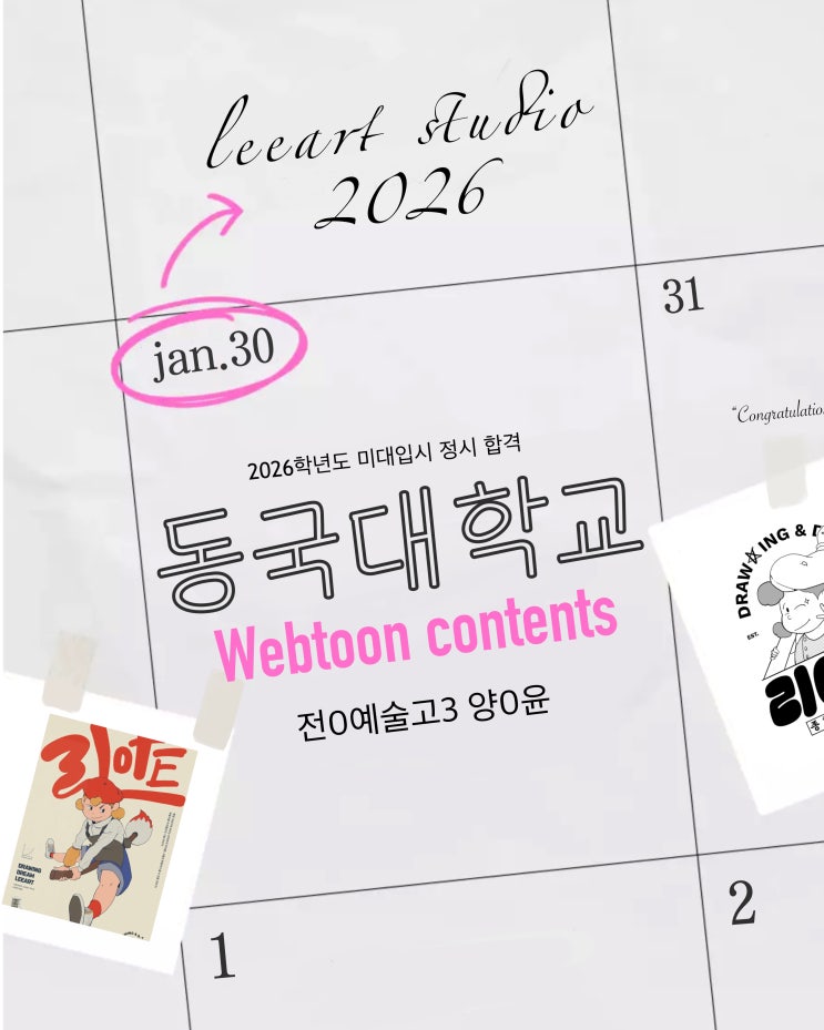안녕하세요 리아트 미술학원입니다. 26년 정시 합격자 안내 입니다. 동국대학교 (웹툰 콘텐츠) 합격을 축하합니다~!! 짝짝 그 외에도 한국영상대학교 순천대학교 목포대학교 전주대학교 호남대학교 를 수시 합격한 친구들도 모두모두 수고 많았어요. 이제 정말 입시 끝! <img src="https://blogthumb.pstatic.net/MjAyNjAyMDRfOTMg/MDAxNzcwMTg4NDc4MDY2.VRitlURb3Bg-HVPDCEc_tyCkvjxjkEOSeQaYAU3OcN8g.Z1Yoji-iNkQrmr9DmnYf3A48lgRL0oMl8-fOyi8wk5sg.JPEG/KakaoTalk_20260202_220630928.jpg?type=s3" />