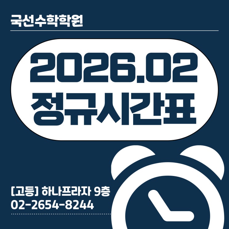 안녕하세요 국선 수학학원입니다 벌써 2월 ! 새 학기 시작 전 마지막 한 달 ! 2월에도 빈틈없는 시스템으로 다음 학년 대비를 위해 열심히 달려보겠습니다 !!! 학습 공백을 완벽하게 보완하며 새 학년 성적이 쑥 ! 올라가고 싶다면 ?! !!! 국 선 수 학 !!! [ 겨울방학수업 추천 시간표 ] 오전 9시 - 오후 12시 : 집중학습 프로그램 오후 1시 - 오후 4시 : 겨울방학 추가수업 오후 5시(&6시) - 오후 9시(&10시) : 정규수업 1 . 목동/대치 최강 교재로 내신 및 수능 대비 2 . 데일리 테스트 및 서술형 테스트로 빈틈 체크 3 . 오답 테스트 및 변형 문제로 취약점 극복 4 . 개념노트로 다지고 오답노트로 보완하고 매일....... <img src="https://blogthumb.pstatic.net/MjAyNjAxMThfMjc1/MDAxNzY4NzE3MjMwMDM0.19NRAD7Gsy0c4CKDRUI92rBEorhdUYuoL9Rx4GbU1eUg.FX1UNkpzs3zqKFKJjV1jpJKFJe_DZ3iE1uW2oVBFB8Mg.JPEG/2%BF%F9.jpg?type=s3" />
