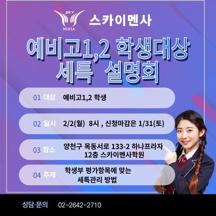 ※ 예비고1,2 <학생 대상> 세특 설명회 ※ ■ 대상: 예비고1,2 학생 □ 일시: 2/2(월) 오후 8시 □ 신청마감: 1/31(토) □ 장소: 서울시 양천구 목동서로 133-2 하나프라자 12층 스카이멘사학원 □ 내용: 학생부 평가 항목에 맞는 세특관리 방법 ※ 원활한 진행을 위해 설명회 시작 5분 전까지 입실해 주시기 바랍니다. ※ 예약 취소시 대기자 분들을 위해 최소 설명회 하루 전까지 취소 전화 부탁드립니다. ※ 참석 예약 및 상담 ☎ 02-2642-2710 최선의 선택 0.1% 전문교육 https://naver.me/xAAK4Jzk 스카이멘사학원 <img src="https://blogthumb.pstatic.net/MjAyNjAxMjZfMTYy/MDAxNzY5NDEyODMyOTUx.BjQxGXHyiRxa0iG-kdvG4gcIQ9BcRDb885FrjBKcgxgg.yTMtNaDhMh8rqRM-veBegIktI_rHzBscxNlApdKoWL8g.JPEG/2026%B3%E2_2%BF%F9_%BC%BC%C6%AF%BC%B3%B8%ED%C8%B8.jpg?type=s3" />