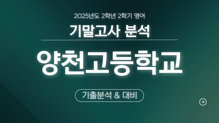 안녕하세요! 페리온영어입니다. 오늘은 양천고등학교 2학년 2학기 기말고사 영어시험을 전체적으로 총평하여 난이도와 유형을 분석해 보겠습니다! 양천고 2025년도 2학년 2학기 기말고사 분석 ☑️ 점수 배점 ▪️ 선택형 : - 듣기 8문항 및 독해 17문항 x 문항별 소수점 배점 (평균 5점) = 75점 ▪️ 서답형 : - 서답형 및 서논술형 5문항 x 문항별 배점 (평균 5점) = 25점 ☑️ 개별 문항 분석 ▪️ 교과서: 영어I 천재(이) 교과서 5-6과 ▪️ 모의고사 : 2025년 고2 10월 모의고사 32, 37-38, 40-42번 ▪️ 영어소설 A Long Walk to Water: Ch. 15-18 ▪️ 학교유인물 및 추가지문 ☑️출제 유형 ▪️ 선택형 : · 교과서 내용 이해....... <img src="https://blogthumb.pstatic.net/MjAyNjAxMzBfMzAw/MDAxNzY5NzM5NDQxNDU2.7S-Uw9jW3-NURu1tJZmRUe_2MivUKbeEV10wRDF7hlcg.4R9ZCViuXED_q3q59EYjO1ia1W51WAUmM0lxtQf1gbAg.PNG/001.png?type=s3" />