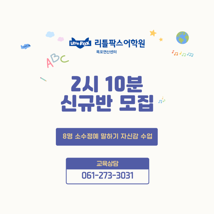목포 초등영어학원 2시 10분 신규반 모집 안내|8명 소수 정예 초등 영어 시작