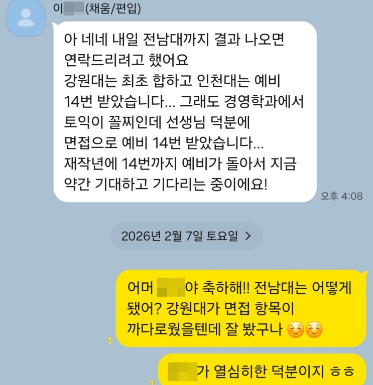 수시에 이어 26학년도 정시와 편입 면접도 결과 기록을 남깁니다. 수시에 비해 학생이 적지만 채움스피치를 믿고 와주신 학생들의 합격을 위하여 12월~1월 쉬지 않고 달렸네요~! 정시에는 특히 면접을 보는 대학이 적지만, 편입면접을 보는 대학들은 많아서 해를 거듭할 수록 채움스피치를 찾아주시는 분들이 늘고 있습니다. 항상 감사합니다~!!! 지금이 3월인데 몇개월만 지나면 벌써 7월이 다가오고 27학년도 입시가 시작됩니다. 26학년도 끝낸지 얼마 안되었는데.... 정말 시간이 빠르게 가네요>< 정시로 합격한 분들, 편입으로 새로운 곳에서 대학생활을 하시는 분들. 모두 새출발을 응원하겠습니다^^ <img src="https://blogthumb.pstatic.net/MjAyNjAzMThfNyAg/MDAxNzczODExNTA1MjMx.t-OgPicTTBfrtDwvRkY36bOEp0b8Ipj87Y-pvCdIAyMg.l5U1Byrjt6zBbaS8lkGeZZHEDroeTNx6tUQPCSpcScog.JPEG/%B0%AD%BF%F8%B4%EB_%B0%E6%BF%B5_%C6%ED%C0%D4_%C0%CC%C0%B1%BC%AD.jpg?type=s3" />