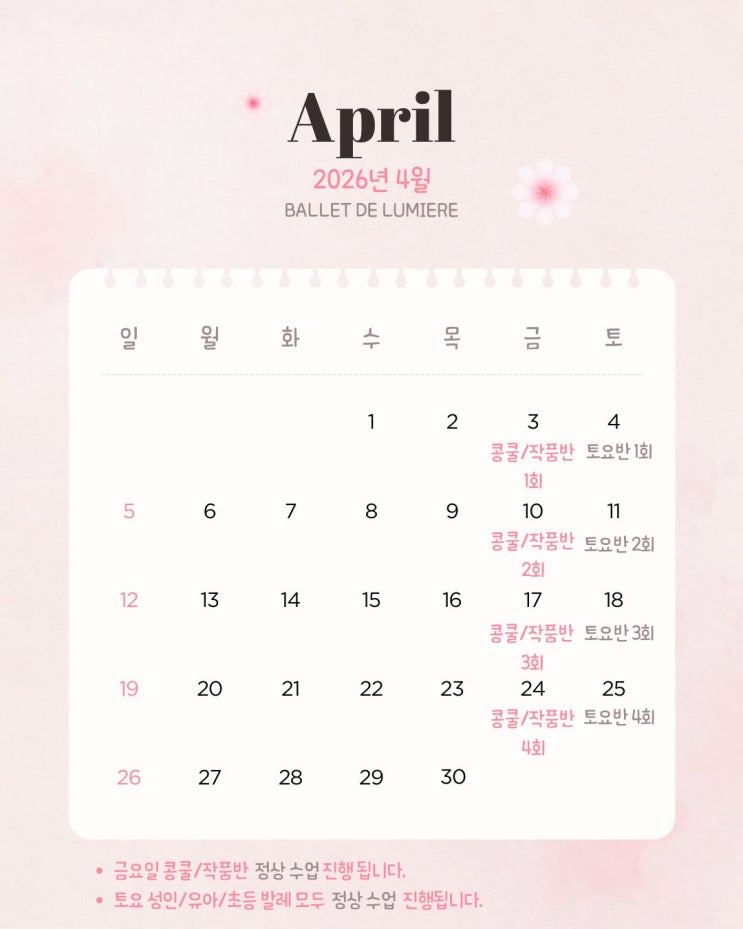 발레 드 뤼미에르 무용학원 4월 안내 안녕하세요, 발레 드 뤼미에르입니다 2026년 4월 학원 일정 안내드립니다 4월 휴무일 안내 4월 휴무일은 없습니다! 모든 수업 정상적으로 진행됩니다 수업 안내 ✔️ 금요일: 콩쿨/작품반 정상 수업 진행 ✔️ 토요일: 성인/유아/초등 발레 모두 정상 수업 진행 따뜻한 봄과 함께 즐거운 수업 이어가요 감사합니다 <img src="https://blogthumb.pstatic.net/MjAyNjA0MDJfMTIx/MDAxNzc1MTExNTk4NzI0.rut7ObTEDZn8ykHn9xtUEBvOpx_2NAz-LgZbYcrgXC0g.Zae2Em3o_EQmPpJ_O7njtfDw6CL9-FIYcFcEBWVZ90Qg.JPEG/26%B3%E2_4%BF%F9_%C8%DE%B9%AB%C0%CF%C1%A4.jpg?type=s3" />