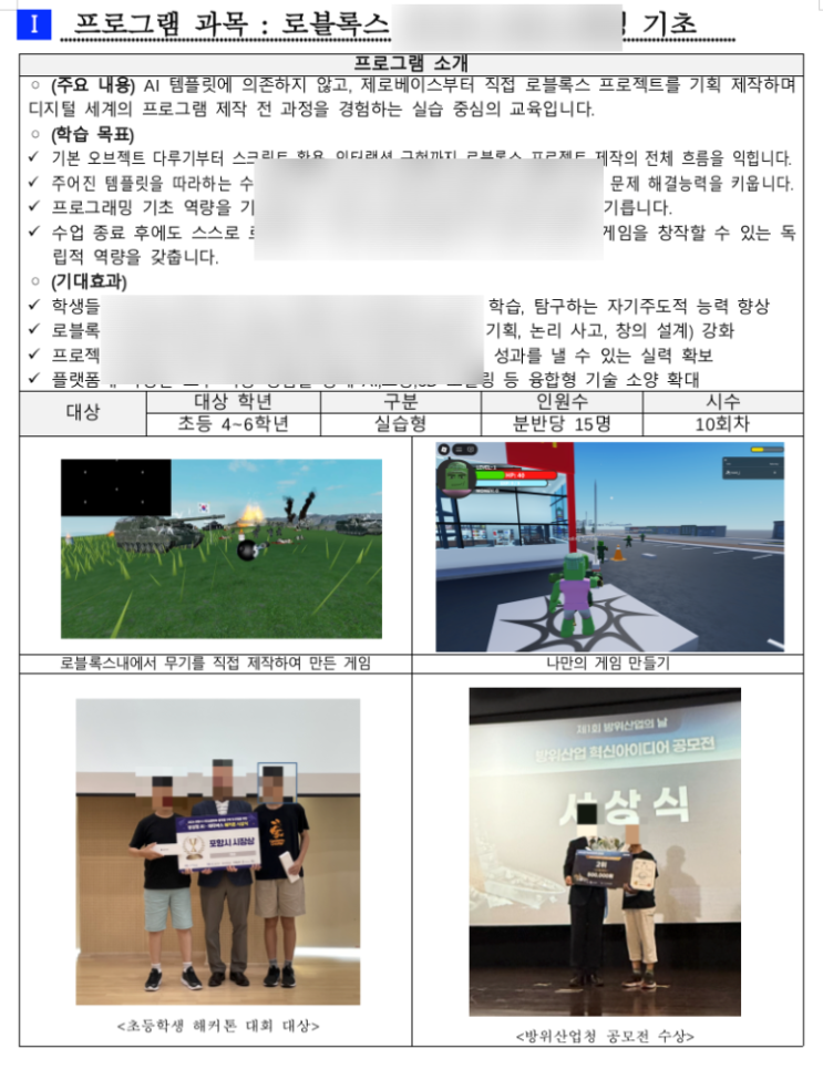 안녕하세요 오늘은 노원구에 있는 노원1종합사회복지관에서 진행하고 있는 로블록스 프로그래밍 수업을 소개시켜 드립니다. 노원 종합복지관은 2023년부터 매년 프로그래밍 방과후 수업을 진행하고 있는데요 이번에는 저의 적극적인 추천으로 로블록스 수업을 진행하게 되었습니다. 요즘같이 AI가 코드를 다 만들어주는 시대에 프로그래밍 수업을 어떻게 해야 고민이 많은데요 그럼에도 여전히 프로그래밍 자체의 중 요도는 남아 있을것입니다. 아마 텍스트 언어를 직접 작성 할 필요는 없지만 블록코딩으로 알고리즘 수식도를 읽을 수 있을정도는 되어야 겠죠. 강의 계획서이고 2개의 분반을 격주로 수업해서 총 5회씩 10회 수업을 진행하고 있....... <img src="https://blogthumb.pstatic.net/MjAyNjA0MDdfMjU1/MDAxNzc1NTMwODkzNzU4.67OvVdnqKa00JGd4Nx1rmoji8-1OumPdgsKVfzx64Z8g.bthv6n2C8n8g7RPBc3u_HPQssIIpyLSm_azKco5O4d4g.PNG/SE-36d81d11-6eab-46e3-affb-993b8881c8ec.png?type=s3" />