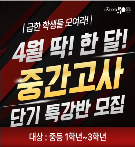 안녕하세요 아이의 성장을 가장 가까이에서 함께하는 눈높이러닝센터 대동 학원입니다. 중간고사가 다가오는데 혹시 아직 준비가 부족하다고 느끼시나요? 걱정만 하기엔 아직 늦지 않았습니다. 지금 시작하면 충분히 바꿀 수 있습니다. 그래서 준비한 4월 단 한 달, 집중 성적 상승 프로젝트! 4월 단기특강 모집 안내 대상: 중학교 1학년 ~ 3학년 기간: 4월 한달 완성 프로그램 모집 인원: 선착순 5명 (소수정예 집중관리) 접수 마감: 4월 9일(목) 특히 중1 학생의 경우 1학기에 시험을 보지 않는 학교도 많지만, 2학기 중간·기말고사 실전 대비를 위해 미리 시험 경험을 쌓는 것이 매우 중요합니다. 눈높이....... <img src="https://blogthumb.pstatic.net/MjAyNjAzMzFfNTIg/MDAxNzc0OTI0MzMwNDIx.ahFrIfkPFO2r9QfBKdBw3Vecie7l0VYJTKGhQrziuU4g.57lpGqAIGfoxaYroErrZ4nKqlnXQ4r7pc3NdQyE0Iskg.PNG/%C8%AD%B8%E9_%C4%B8%C3%B3_2026-03-31_112516.png?type=s3" />
