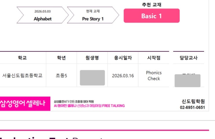 안녕하세요, 신도림수학삼성영어입니다. 소중하고 사랑스런 씨잇회원에 대해 포스팅 해보려 합니다 이번 사례는 단순히 진도가 빠른 학생이 아니라, 잘못 쌓였던 기초를 바로 잡으면서 빠르게 올라간 케이스입니다. 시작 상태 - 고학년이지만 정확한 레벨을 찾지 못한 상태 - 파닉스를 “배운 적은 있지만 정리되지 않은 상태“ - 학습에 대한 자신감이 떨어진 상태 즉, 읽기는 되는 것 같지만 기본 음가와 규칙이 불안정한 상태였습니다 그래서 이렇게 시작했습니다 - 파닉스 기본 음가부터 다시 정리 - 읽기 연습을 통해 정확도 확보 - 이전에 배웠던 내용들을 체계적으로 재정리 이 과정에서 “어려움”이 아니라 **“이해되니까 쉬워지....... <img src="https://blogthumb.pstatic.net/MjAyNjA0MDRfODIg/MDAxNzc1MjczNTI0NDkz.SqhjYSsOyHpXGUb7TUSvkzUFcJXdI9UwPLzfMX2G0yUg.kXLPIrtW0-rIaaSs5Vt2haY-E7y6QJ9lZMV3wmEbqD4g.JPEG/IMG%A3%DF3778.jpg?type=s3" />
