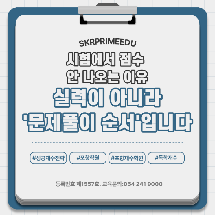 안녕하세요, 포항독학재수전문학원 스카이프라임에듀입니다 ^^ 재수생 상담을 하다 보면 공통적으로 듣는 말이 있습니다. “열심히 했는데 시험에서 점수가 안 나와요.” 하지만 깊이 들여다보면 문제는 실력이 아니라 시험 전략, 그중에서도 문제풀이 순서에 있는 경우가 많습니다. 많은 재수생들은 시험지를 받으면 바로 눈에 보이는 문제부터 풀기 시작합니다. 익숙한 문제, 쉬워 보이는 문제에 끌려 자연스럽게 손이 가기 때문입니다. 그런데 이 방식에는 치명적인 함정이 있습니다. 한 문제에 예상보다 많은 시간을 쓰게 되면, 뒤에 있는 더 쉬운 문제를 놓치게 됩니다. 결국 전체 점수는 떨어지게 됩니다. 여기서 한 번 생각해봐야 합니다....... <img src="https://blogthumb.pstatic.net/MjAyNjA0MDVfNDMg/MDAxNzc1Mzc3NDA3Mjcz.9EcEti0538hN8Fct2T2nb2hMIGKhJI7EsQQDIoSbmlwg.uEBVkEcDugowKXzwjxbLf8rVbiaaRj1quIqhjwQwpFQg.PNG/1775377032183.png?type=s3" />