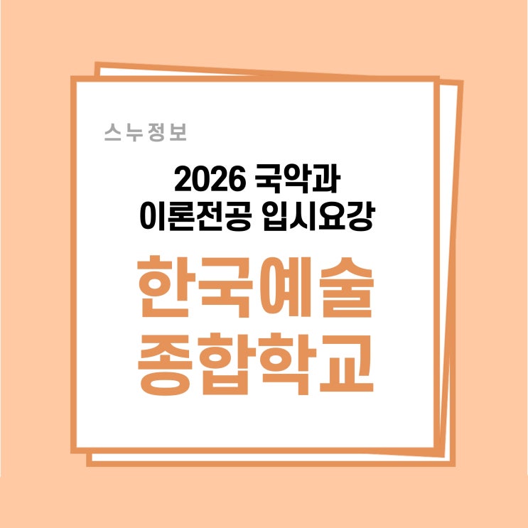 안녕하세요, 스누국악 입니다. ☀️ 2026년 붉은 말의 해가 밝아온 게 엊그제 같은데 어느새 올해의 첫 번째 달이 다 지나가고 있습니다. 한 달을 돌아보며 기쁜 날은 다시금 마음에 담고 추웠던 날은 1월의 바람에 흘려보내면서 다가오는 2월을 조금 더 따뜻하게 맞이해보면 좋겠습니다. 첫 달의 끝자락에서 두 번째로 소개해드릴 2026학년도 국악이론전공 입시요강은 ‘한국예술종합학교’ 입니다. 한국예술종합학교(이하 한예종)는 예술 실기 및 이론의 전문적인 교육을 통한 전문예술인 양성을 목표로 설립된 문화체육관광부 산하의 국립고등교육기관입니다. 한예종은 우리나라 최고 수준의 예술 전문 교육기관으로 널리 알려져 있....... <img src="https://blogthumb.pstatic.net/MjAyNjAxMjFfMTU3/MDAxNzY4OTY5MDMwNjM3.uYl89W3K4R9AWqDLsABKVIgI4ZGtUknQ06CBITV8ySEg.Ne1ZzP-GehVF1viVdQ7s0gbwal83VBEkxcZ5tsAemQwg.JPEG/%BD%BD%B6%F3%C0%CC%B5%E51.jpeg?type=s3" />