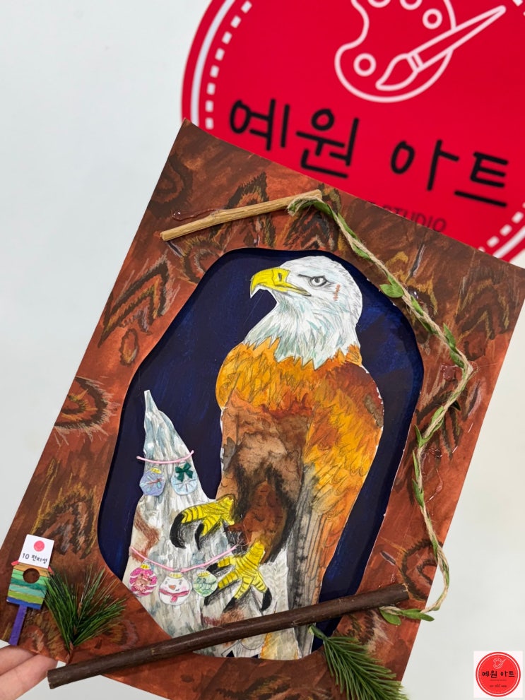 안녕하세요 예원아트입니다! 이번 시간에는 우리 예원아트 남아 친구들의 작품을 포스팅해보도록 하겠습니다. 이번 12월 수업에서는 동물의 털 질감과, 나무의 질감을 묘사해 보는 시간이었습니다. 우리 작가님은 사진 자료를 보며 독수리의 특징을 스스로 찾아보고 표현하는 시간을 가져보았습니다. 세밀한 표현이 필요한 작업이라 집중력이 오래 유지된 수업이었습니다. 갈색 계열 안에서도 여러 색을 섞어 사용하며 자연스러운 색의 깊이를 만들어보았어요. 수채화 물감을 밑 바탕으로 칠해주고, 건식 재료인 색연필로 묘사해 주고 있어요. 우드락을 구멍을 뚫어서, 나무 판을 만들어 줄 거예요~ 배경 색과 동물의 색을 구분하며 주제 표현을....... <img src="https://blogthumb.pstatic.net/MjAyNjAxMjBfMjI3/MDAxNzY4ODk4ODI4MjE1.JPiKKUVDJ93dz6FDCsd7tBXXFsTau5qkqGkvre8ajFUg.KWScKskR0tOiN7uGzgi6n3DbUMqnLdAq8fnhgUprh2cg.JPEG/KakaoTalk_20260120_162125282_%287%29.jpg?type=s3" />