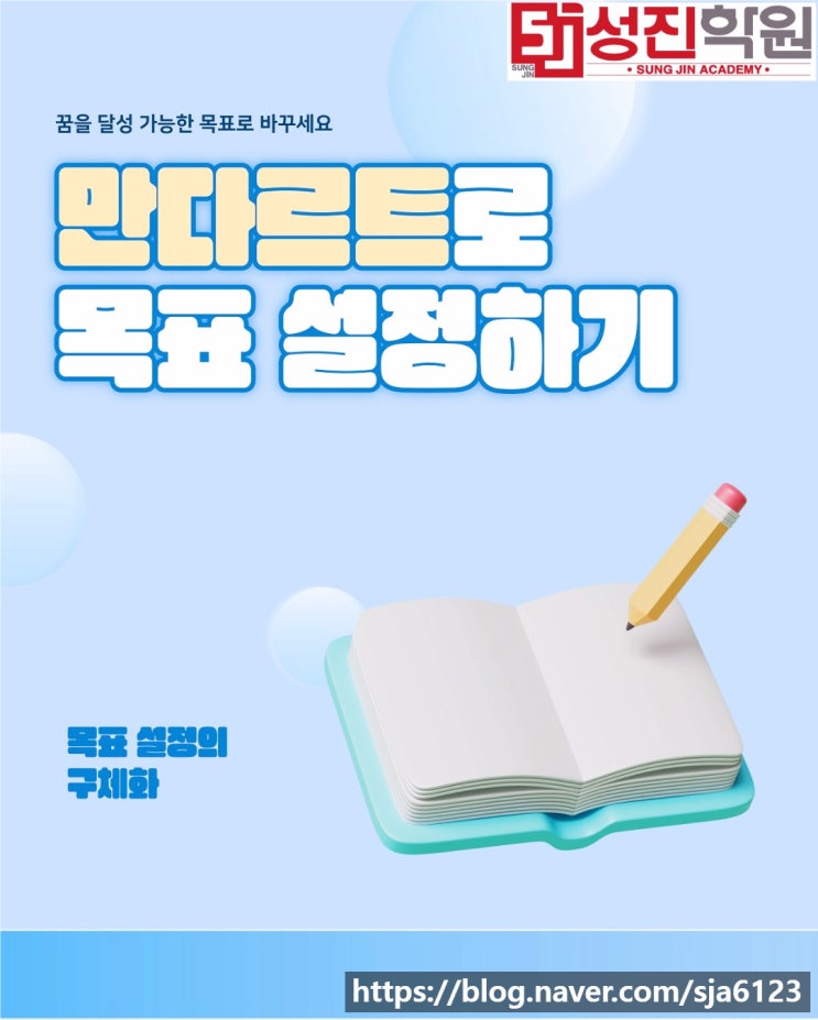 목표 달성, 만다라트로 실천해요! 1월도 이제 다 지나고 있는 지금! 신학기에 계획한 공부, 진로목표를 차근차근 이루고 계시나요? 성적 향상, 열공하기 같은 큰 목표는 잡았지만 구체적으로 어떻게 실행해야 할지 막막한 학생들이 있다면 여기 주목! 오늘도 여러분의 목표 달성을 응원하는 광영여고 내신 기출 분석 전문 성진학원에서 만다라트 계획법을 소개합니다. 목표는 구체적일수록 좋다는 말 한 번쯤은 들어보셨을 텐데요, 만다라트 목표 설정법은 목표를 구체적 행동으로 옮길 수 있도록 설계하는 SMART한 방법입니다. S(Specific) : 구체적으로 M (Measurable): 특정 가능하게 A (Action-oriented) : 구체적 행동에 근거하여 R (Realis....... <img src="https://blogthumb.pstatic.net/MjAyNjAxMjFfMzMg/MDAxNzY4OTg2OTI3MDM0.NbANttDc4HfmazW4l27pDgtux2T2zrOUjva0J1kTDwsg.i2JIa37Ifvj9OWwuqU9G2LUP-YaAYQvKj3LYLKP9Sbgg.JPEG/%BD%BD%B6%F3%C0%CC%B5%E50001.jpg?type=s3" />