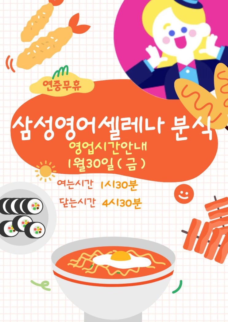 삼성영어셀레나 분식 OPEN!!! 일시: 1월 30일(금) 여는 시간: 1:30 닫는 시간 4:30 영어 공부에 열중인 ~ 우리 셀린이들이 맛있는 것 먹는 시간!! 2월 영어 공부를 달리기 위해서~ 힘을 모으는 시간이 필요하겠죠^^ 우리 셀린이들은 자신들의 학원시간에 보내주시면 됩니다. 시간 변경은 하루 전에 연락주세요! 항상 사랑합니다~ 우리 학부모님!! <img src="https://blogthumb.pstatic.net/MjAyNjAxMjNfMTQ4/MDAxNzY5MTQ4MTI4NTQ3.YX5ER2AwuXvrwgUhVqKulIhMefpyC-ynvaB5MYOboBkg.Z_0KQp3MG5rJVg4cyegTTo74YInvzbUQfP3Ap0cb4d8g.JPEG/IMG%A3%DF9363.JPG?type=s3" />