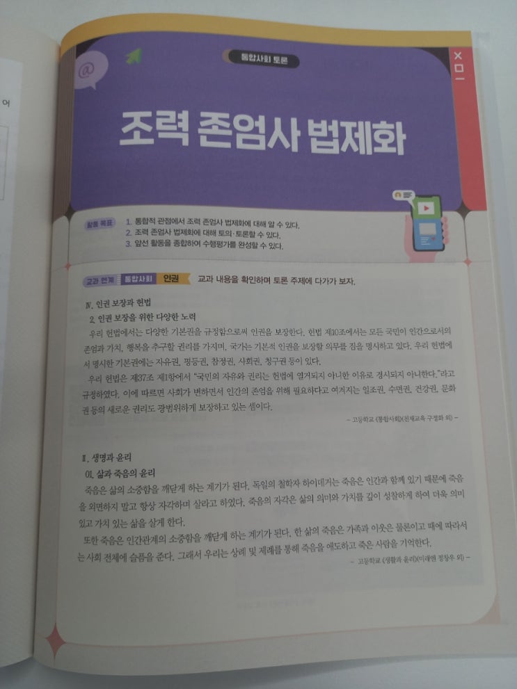 조력 존엄사법이 발의되며 존엄한 죽음에 관한 제도의 필요성이 제기되고 있는데,'조력 존엄사 법제화' 논제를 통해'죽음에 관한 자기결정권 및 생명 존중'에 대한 다양한 관점을 살펴보자. 조력 존엄사는 환자가 스스로 약물을 투약한다는 점에서 의사가 직접 환자에게 약물을 투약하는 전통적 의미의 안락사와는 차이가 있으나 환자 자신의 의지로 삶을 끝맺는다는 점에서는 안락사와 본질적으로 같다. 조력 존엄사는 약물을 통해 인위적으로 생을 앞당겨 끝맺는다는 점에서 연명 조치에 해당하는 의료 행위를 중단해 자연적으로 죽음을 맞이하는 존엄사와 차이가 있다. 우리나라에는 존엄한 죽음과 관련하여 ....... <img src="https://blogthumb.pstatic.net/MjAyNjAyMDNfMzkg/MDAxNzcwMDc5OTUyOTI5.d6aeMAEv7n2LU8EozJE-T4FGY2pOXu99vm2IL5Sv4mYg.Qh3IH2ZbxbbOL_JkarZHd4-JKe97OFudax71IGNOCUwg.JPEG/900%A3%DF20260202%A3%DF224512.jpg?type=s3" />