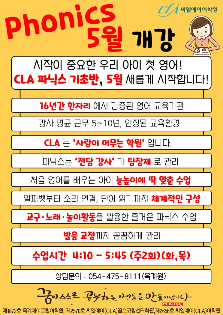 구미 옥계/산동 영어학원 CLA어학원(옥계원) 5월 파닉스반 모집