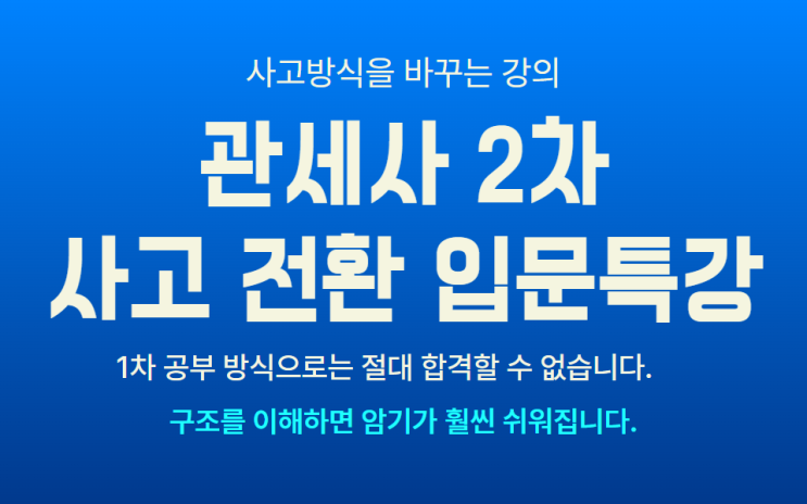 관세사 1차 시험이 끝남과 동시에 2차 시험을 준비하기 위하여 모두 바쁜 시간을 보내고 계실 것 같습니다. 2026년 관세사 1차 시험은 다행히(?) 무난한 수준으로 출제되어 합격 인원이 전년에 비하여 2배 이상 증가할 것으로 생각됩니다. 따라서 내년 2027년 관세사 2차 시험은 치열할 것으로 예상됩니다. 그래서 관세사 2차 시험 준비를 잘하셔야 2유예로 합격하실 수 있을 것입니다. 그동안 1차 시험을 공부하느라 힘드셨겠지만 이제부터는 본격적으로 관세사 2차 시험을 준비해야 하는 단계에 왔습니다. 2차 시험이 본 게임입니다! 하지만 많은 분들이 1차 시험공부하듯이 2차 시험을 준비하기에 시행착오를 겪으면 소중한 시간을 허비하고 나....... <img src="https://blogthumb.pstatic.net/MjAyNjAzMjNfMTAg/MDAxNzc0MTk5OTM3OTY4.lc0k6ihRgEi9dIf_Ck8-jSzBw9Kz_oZXB9tfnbXcsWYg.XK9MmiaEGhjFZa9kxzwsUOL2dWHpLez6jHMqM8yKYE4g.PNG/2026%B4%EB%BA%F1_%B0%FC%BC%BC%BB%E7_2%C2%F7_1%C2%F7_%B4%DC%B0%FA_%281%29.png?type=s3" />
