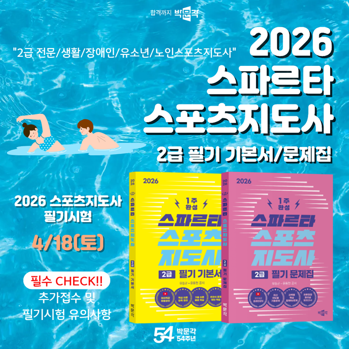 안녕하세요. 건강하고 발전하는 삶을 위한 여러분의 도전을 함께합니다. 2026 스파르타 스포츠지도사 2급 필기 기본서+문제집 (별권 및 세트) 지난 3/26(목)~3/30(월)까지 생활스포츠지도사 2급 및 장애인 2급, 유소년, 노인스포츠지도사 원서접수가 진행이 되었습니다. 일시에 많은 인원이 몰리는 것을 방지하고자 올해 처음 분산 접수가 진행되었고, 마지막 접수일인 3/30(월)까지 고사장이 증원되어 스포츠지도사에 대한 관심을 다시 한번 확인할 수 있었습니다. 2급 생활·장애인, 유소년, 노인스포츠지도사 추가 접수 추가접수: 4.2(목) 10:00~18:00 응시수수료 납부: 4.2(목) 10:00~23:30 또는 해당 금융기관 서비스 마감 전 2급 생활·장애....... <img src="https://blogthumb.pstatic.net/MjAyNjAzMzFfMTk3/MDAxNzc0OTQzOTU1MDk1.oFwmHHq6XJX9dVDG2EadgWOcv0zrNjcHeBcVSwVDzqgg.20tS8miMCdURiORz91KuJ4uPAeBuwP2DttT2pQFsX7Ug.PNG/359.png?type=s3" />