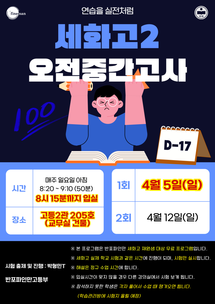 [반포파인만 고등관] 2026 1학기 중간대비 세화고2 오전 중간고사 ※ 날짜 : 4/5(일) & 4/12(일) ※ 시간 : 08시20분 ~ 09시10분(50분) / 8시15분 까지 입실 ※ 장소 : 고등2관 205호(교무실 건물) ※ 재원생들의 내신 1등급을 기원합니다 ※ 문의사항: 02-534-9266(반포 고등) <img src="https://blogthumb.pstatic.net/MjAyNjA0MDRfMTk0/MDAxNzc1MjgwMjc3MjQ3._1kUjY_iHohwSAYDBhrjBSdXuTEPXraiJsjeYU09C48g.FhVXDnAD08jAV87z9cDUhfd5MV5XwUotBWzhVd1F9DAg.PNG/KakaoTalk_20260404_141907784.png?type=s3" />