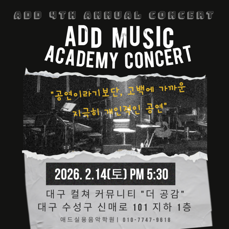 애드 <제4회 정기공연> 애드실용음악학원 <제4회 정기공연>이 2025년 2월 14일 토요일 오후 5시 30분 컬쳐 커뮤니티 ’더 공감‘ (주소:대구 수성구 신매로 101, 지하 1층)에서 진행됩니다. 애드 수강생들이 열심히 준비 중이니 편하게 오셔서 무대를 빛내주시면 감사하겠습니다 애드 4번째 정기공연에 대한 문의는 학원으로 문의주세요 애드실용음악학원 ✅ 수강과목 보컬, 피아노, 작곡, 기타, 댄스, 베이스, 비트메이킹, 단기축가, 우쿨렐레, 일렉, 레코딩 (취미반, 성인취미반, 입시반, 오디션반) ✅ 운영시간 평일-13:00~22:00 토요일-13:00~20:00 일요일, 공휴일 휴원(공휴일 운영시 공지) ✅ 전화번....... <img src="https://blogthumb.pstatic.net/MjAyNjAxMjhfMjY3/MDAxNzY5NTk0Nzk2NjU2.xIegIA8cgTtU2a6UjKlLLIKRPUGxLeYgatBFqQHVWpIg.x3lOXbkyBSrgqyyFDJwuKipT7YkgCFr74OflzktFzwwg.PNG/%C1%A6%B8%F1%C0%BB_%C0%D4%B7%C2%C7%D8%C1%D6%BC%BC%BF%E4_-007_%281%29.png?type=s3" />
