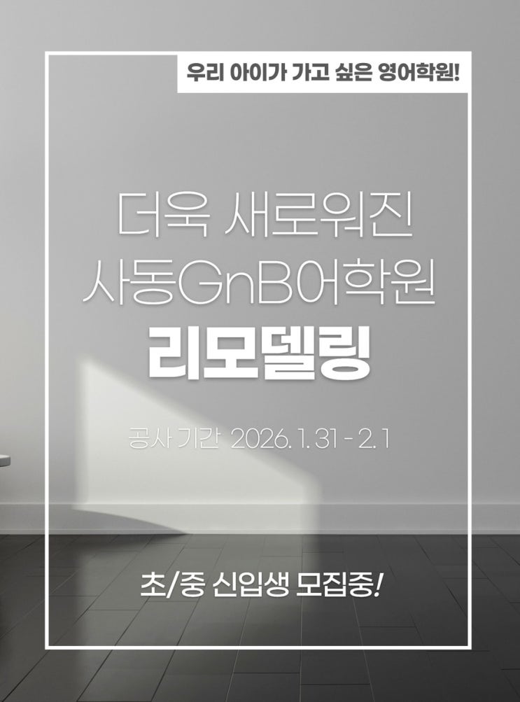 사동GnB어학원 리모델링 안내❤️ 사동GnB어학원은 학생들이 매일 머무는 공간을 더 쾌적하고 안전한 학습 환경으로 만들기 위해 지속적으로 시설 관리와 환경 개선을 진행하고 있습니다. 2026년 신학기, 더욱 쾌적하고 새로워진 사동GnB어학원에서 재미있는 영어학습을 시작합니다~! ✨✨✨ 앞으로도 사동GnB어학원은 공간 하나까지 믿고 맡길 수 있는 학원이 되도록 꾸준히 노력하겠습니다. ✅ 영어는 사동GnB어학원 ✅ 수학은 비상아이비츠학원 ✅ 독서·논술은 책통클럽 ✅ 진로·입시는 디에듀브릿지컨설팅 경산에서 공부의 기준을 세우는사동아카데미! 자녀교육, 자신 있습니다! 교육문의: 811-0042 #사동GnB어학원 #학원리모델링 #....... <img src="https://blogthumb.pstatic.net/MjAyNjAxMjlfMjMz/MDAxNzY5NjczNTk0ODg1.s2seQkzHenVI-B0Oj7jdOULcPsnfuW_FLYmV06e14MEg.oua_nEOehtw1DaFnxDZE1RT_5xY4ukIBLMTdx8KaTY4g.JPEG/IMG%A3%DF1693.JPG?type=s3" />