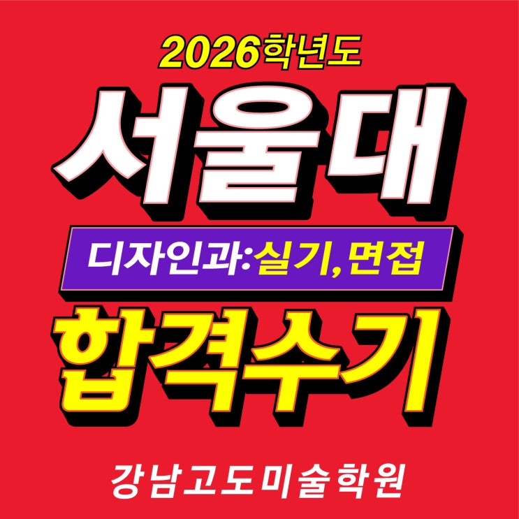 서울대 디자인과 정시 실기 면접 합격수기 강남미술학원 강남고도미술학원 안녕하세요~ 최상위권 미대입시 명문 강남고도 진학상담소입니다~ 서울대 디자인과 입시는 흔히 단순히 그림만 잘 그려서도 안 되고, 공부만 잘해서도 안 됩니다. 수능 성적이라는 탄탄한 기초 위에 독창적인 서울대 디자인과 실기 능력을 키우고, 마지막으로 자신의 생각을 논리적으로 풀어내는 면접까지... 이 삼박자를 모두 갖추기란 결코 쉬운 일이 아닙니다. 오늘은 2026학년도 서울대 디자인과 정시 미대입시에서 당당히 합격의 영광을 안은 학생의 생생한 서울대 디자인과 합격수기를 통해, 과연 어떤 전략이 합격을 만들어냈는지 그 비결을 공유해 드리고자 합니....... <img src="https://blogthumb.pstatic.net/MjAyNjAzMjBfMTQ2/MDAxNzczOTkxMzQzMzE0.YdwtJH5pX8MGU9TcaOqILJ1Uwjygps47On38Pzo5tyog.XtNY_15j13KxvGsJfRQcak-95SwEYD3laD673BrMUlwg.JPEG/2026%BC%AD%BF%EF%B4%EB-%B5%F0%C0%DA%C0%CE%B0%FA-%C1%A4%BD%C3-%C7%D5%B0%DD%BC%F6%B1%E2.jpg?type=s3" />