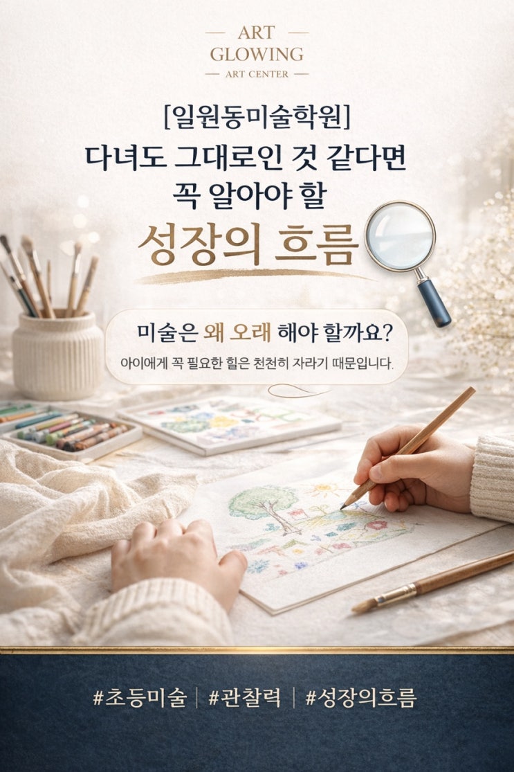 미술은 왜 오래 해야 할까요? 아이에게 꼭 필요한 힘은 천천히 자라기 때문입니다 아이를 미술학원에 보내다 보면 이런 생각이 듭니다. “미술은 얼마나 해야 할까요?” “몇 달 하면 달라질까요?” “지금 배우는 게 정말 도움이 되고 있을까요?” 이 질문에 대한 답은 생각보다 분명합니다. 미술은 단기간에 결과를 보는 활동이 아니라, 시간을 두고 힘을 키우는 활동입니다. 아트글로우잉이 중요하게 생각하는 것도 바로 이것입니다. 그림 한 장의 결과보다, 그 과정을 통해 아이 안에 어떤 힘이 자라고 있는지를 더 중요하게 봅니다. * 강남 일원동 상록수 아파트 상가에 위치한 아트글로우잉 미술학원 입니다 (대치동, 개포동 부근) 그림보....... <img src="https://blogthumb.pstatic.net/MjAyNjAzMjNfMTY3/MDAxNzc0MjUwMzYxMTQy.gJv_sBnrx488ysXJcnBcNm5eCWtBDR4h3pa8w4dvloYg.ZVoRZnN8hh4RfFV2w1iiqqVQEVbywJPv9B8Mh2rXOl8g.JPEG/725C7241%A3%AD600B%A3%AD41C6%A3%AD9BA0%A3%AD7C9D1F4986F5.jpg?type=s3" />