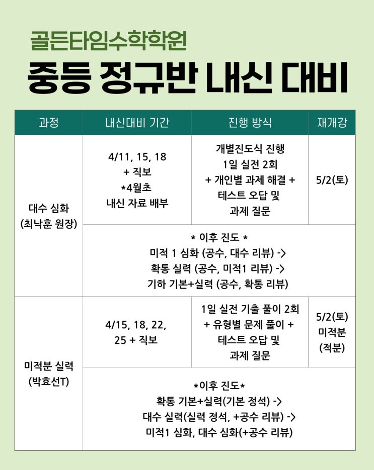 [골든타임수학학원] 중등부 내신대비 기간 안내