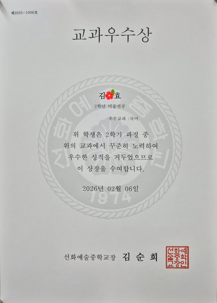 2025년 2학기에도 우리 대치예뜨락 미술학원 학생들이 학업에서도 우수한 성적을 내었네요! 김O효 학생의 교과우수상 수상을 축하합니다~~ <img src="https://blogthumb.pstatic.net/MjAyNjAzMjlfNDkg/MDAxNzc0NzY1MDc3MjYx.IsmZEvCLklAv0GzrmeIo5ym4mSiSgIBOkx9Uqi9zZ04g.H1UNmEesI355DP1XLD8xGHbkRFYXgJ0dE-09jew3Hu0g.JPEG/KakaoTalk_20260208_102202635_03.jpg?type=s3" />