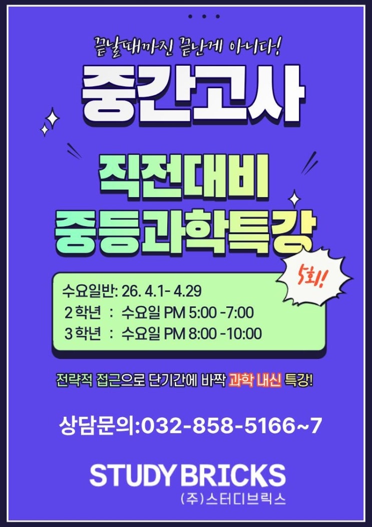 안녕하세요. 송도1공구에 위치한 중,고등 수학과 과학 전문학원 대치스터디브릭스입니다. 이제 우리 아이들이 개학을 하여 바쁜 신학기 생활을 시작한지 벌써 3월 마지막주에 접어들었네요. 1학기 중간고사 내신대비 준비가 4월부터 시작 되는 시기이기도 합니다. 보통 주요과목에는 많은 시간을 할애 하지만 과학 내신 준비는 급하게 암기 식으로 하다보니 좋은 결과 얻기가 어려웠던 경험 있으실거라 생각됩니다. 대치스터디브릭스 송도중등과학관에서는 완벽 내신을 위한 내신 과학 특강반을 중2, 중3 학년별로 나눠서 진행합니다. 이번 중간고사 내신대비는 알차게 단 5회차로 정리 할수 있는 과학 내신 특강을 준비해보았습니다. 과학 전공....... <img src="https://blogthumb.pstatic.net/MjAyNjAzMzFfMjg3/MDAxNzc0OTMzODYzOTA3.u7Qerbd7B84Zja5XJfpZ_MXgu9f4Z1jT012AZWq8RnQg.nrKf-1ODsHxmGw4t4pJyGNpF-IXS9tyZBxzI5tI05Sog.JPEG/%C1%DF%B5%EE%B0%FA%C7%D0%B3%BB%BD%C5.jpg?type=s3" />