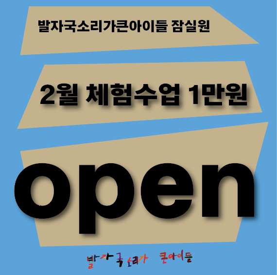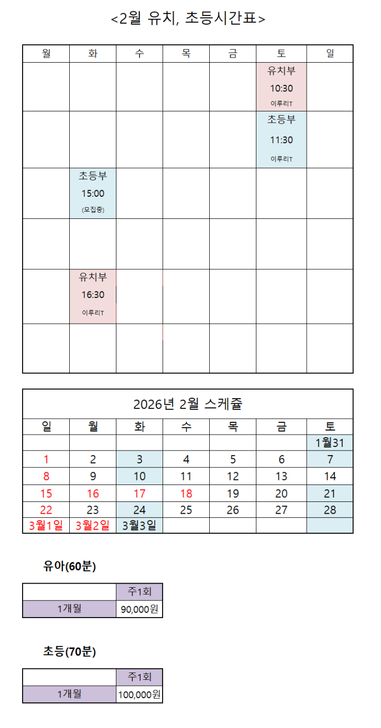 [2월 2일 초등부 월요일 체험수업 안내] ✨ 수업시간 및 정원 ✨ 월요일 12시-1:20시 (1명) 월요일 2시-3:20시 (1명) 월요일 4시-5:20시 (1명) [2월 9일 초등부 월요일 체험수업 안내] ✨ 수업시간 및 정원 ✨ 월요일 12시-1:20시 (1명) 월요일 2시-3:20시 (1명) 월요일 4시-5:20시 (1명) [2월 23일 초등부 월요일 체험수업 안내] ✨ 수업시간 및 정원 ✨ 월요일 12시-1:20시 (1명) 월요일 2시-3:20시 (1명) 월요일 4시-5:20시 (1명) [2월 5일 유치부 목요일 체험수업 안내] ✨ 수업시간 및 정원 ✨ 목요일 4시-4시 50분 (1명) 마감 [2월 12일 유치부 목요일 체험수업 안내] ✨ 수업시간 및 정원 ✨ 목요일 4시-4시 50분 (1명) [2월 19일 유치부....... <img src="https://blogthumb.pstatic.net/MjAyNjAxMjNfMTc1/MDAxNzY5MTQ5NDg4MjU5.011mBa2Tf_j0ohvtSU8xlKKKHeL1FoCNOAP6wGWLzgAg.EAsdykRXK0teV3GAjc321j-zoDp6ysI4LDsQOXrj4Dog.PNG/%BD%BA%C5%A9%B8%B0%BC%A6_2026-01-23_%BF%C0%C8%C4_3.23.23.png?type=s3" />