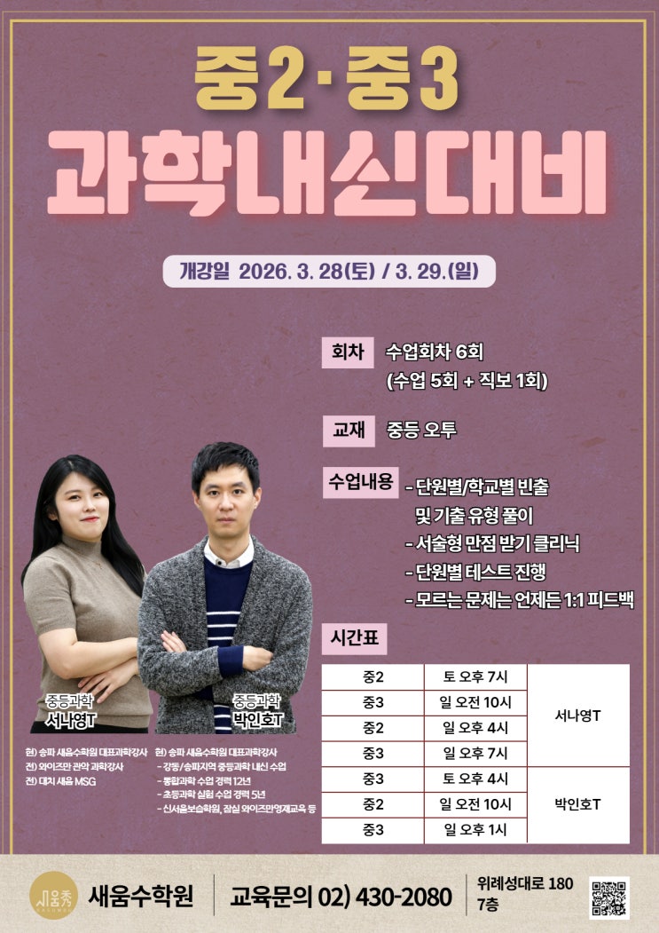 [새움수학원] 중2 • 중3 과학내신대비(3/28(토), 3/29(일) 대개강)