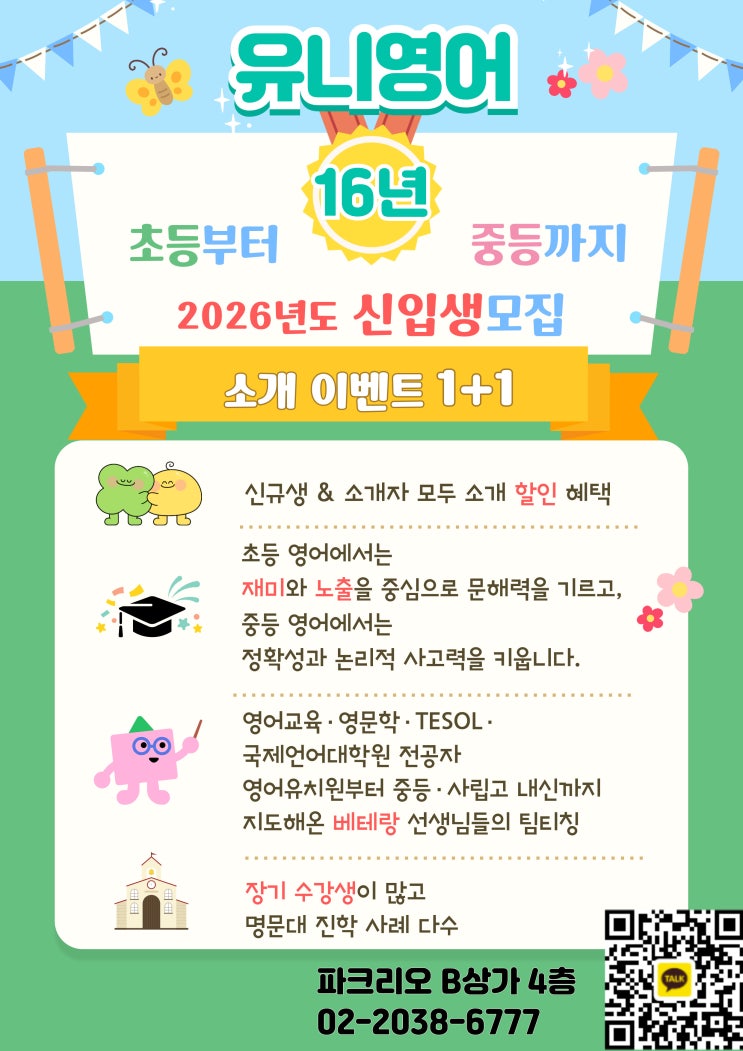 16년 전통의 '유니영어' 2026년 신입생 모집 & 소개 이벤트 1+1