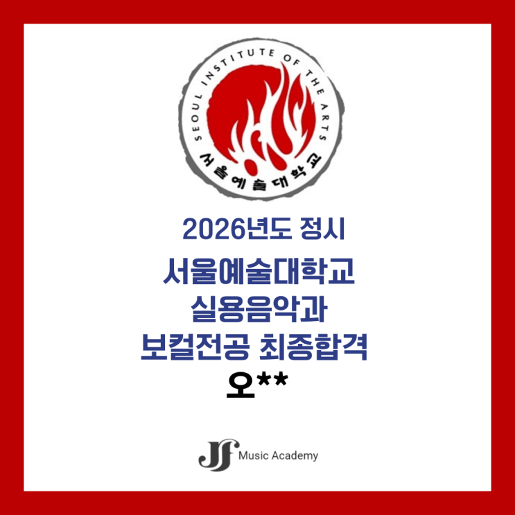 안녕하세요 :) JF 실용음악학원입니다 !! 소재진 원장님 제자 오**님이 2026년 서울예술대학교 실용음악과 보컬전공 정시 최종합격하셨답니다 !! 정말 축하드려요 ㅎㅎ 앞으로 더욱 반가운 소식 기대하겠습니다 ✨ JF 레슨 방향 1️⃣ 추상적인 설명보단, 명확한 피드백 문제점을 정확히 파악하고 학생이 진짜 필요로 하는 연습 방법을 제시합니다. 2️⃣ 기본기 위에 자신만의 색깔을 발성과 호흡을 다진 후 본인만의 개성과 음악성을 입혀 경쟁력 있는 아티스트로 성장합니다. 3️⃣ 장르 밸런스 강화 다양한 장르를 경험하며 자신의 강점을 찾고 실력의 균형을 잡습니다. 4️⃣ 무대까지 함께 준비 표정, 액팅, 손동작, 스타일링까....... <img src="https://blogthumb.pstatic.net/MjAyNjAyMDJfMTc5/MDAxNzcwMDE1OTYwNzY3.BMvDMHvUUOnivYaMkdppeXtMs1PibPWQh10cVwMhXmog.rlU6iScMjec-rwFgFuO2rhfja_aXOVlfCsKR7ZDcIEwg.PNG/25%BC%F6%BD%C3%C7%D5%B0%DD-008.png?type=s3" />